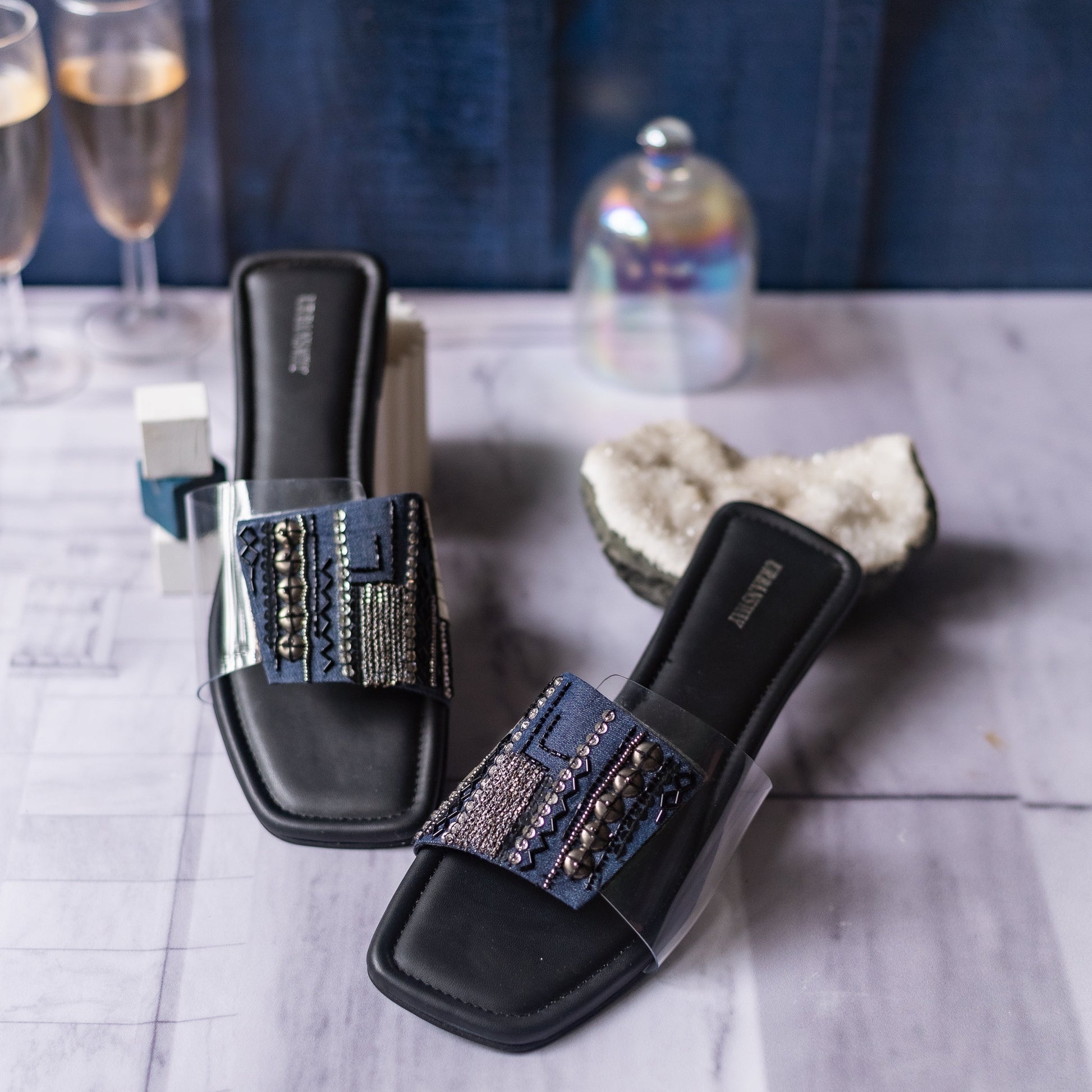 A classic denim based flats embroidered with antique silver chains that is going to make you look classy and starry!!
