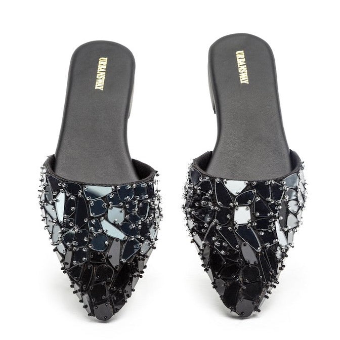 This creation is a unique form of art that has been structured and detailed into. An abstract design with shiny mirror, finely shaped into geometric figures makes this mule a very dramatic piece. There’s no need to put efforts to pull this off.