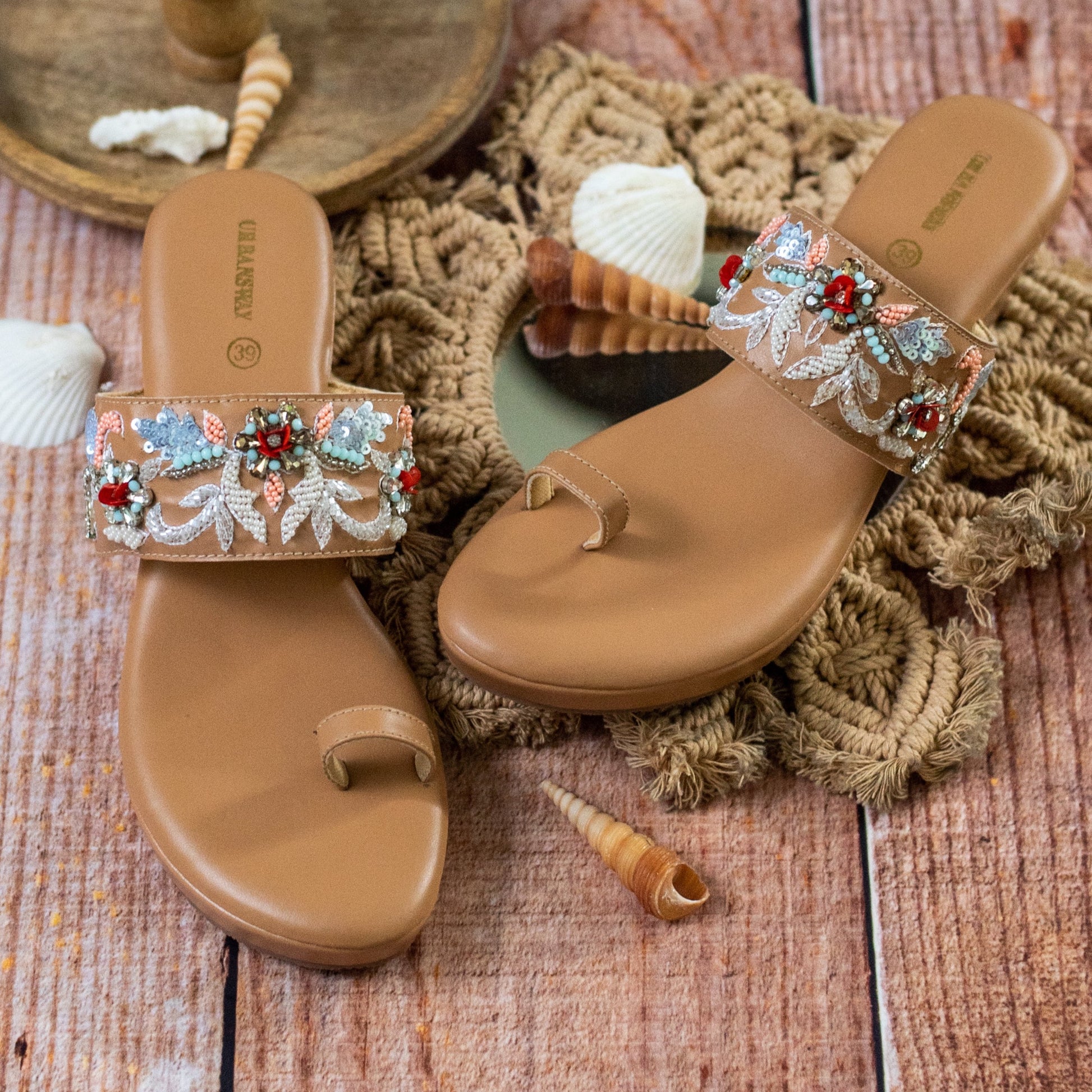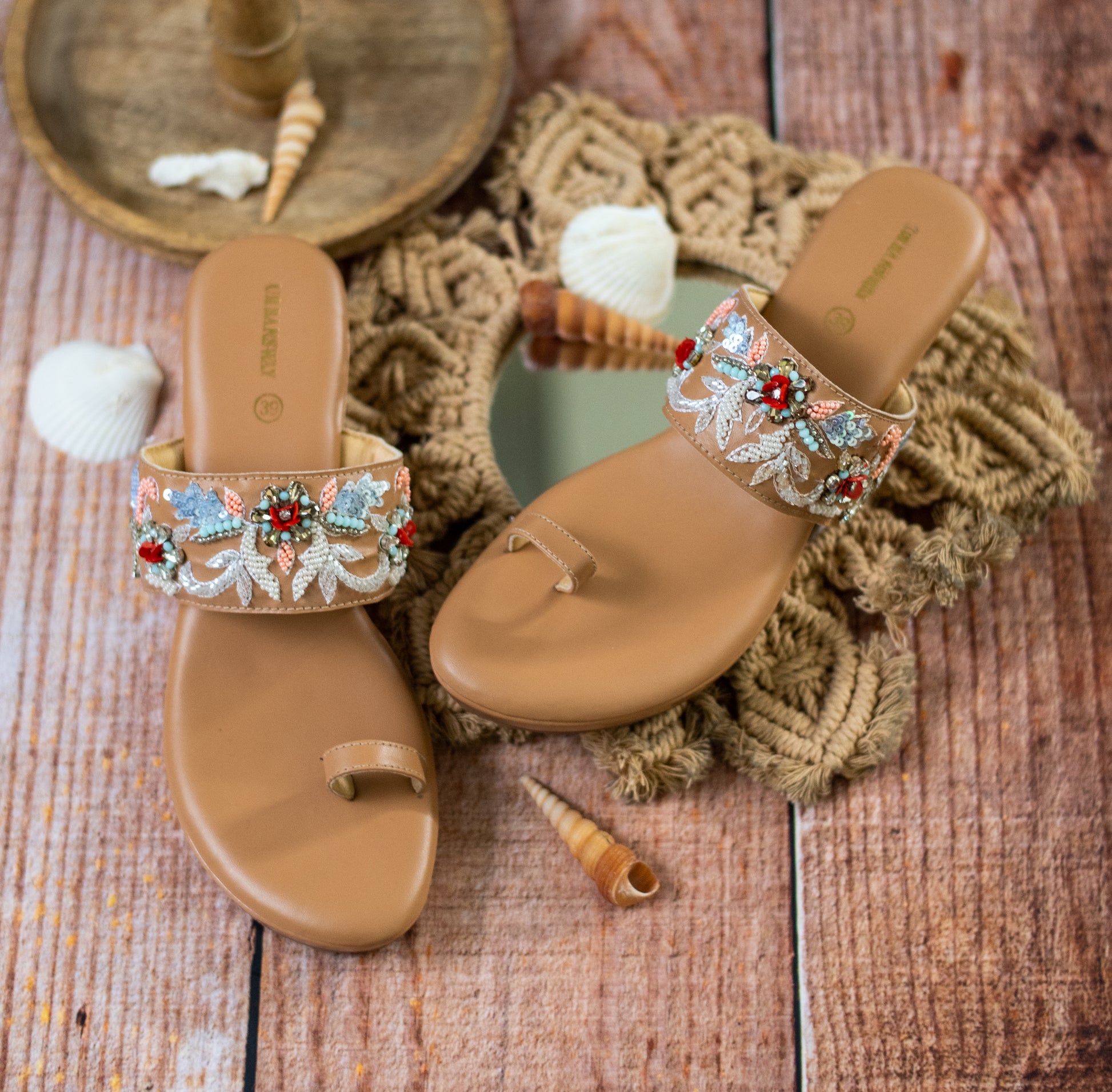 Nude floral wedges in vegan faux leather base with pearls and beaded work. It has a double padded underlining and 2 inch heels.