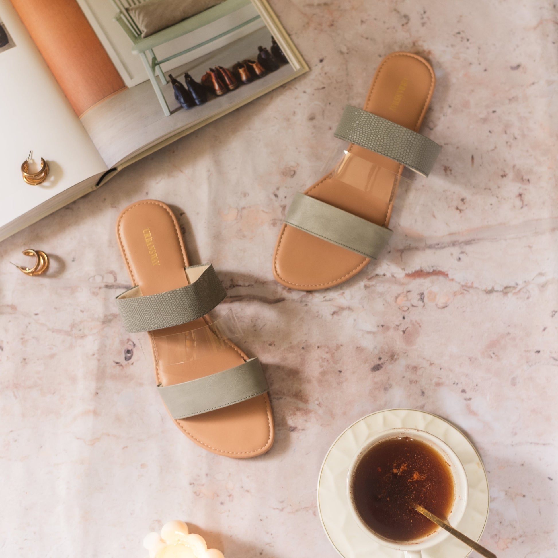 Featuring a pair of gray and tan slip-in flats in vegan faux leather base with straps and double padded underlining.
