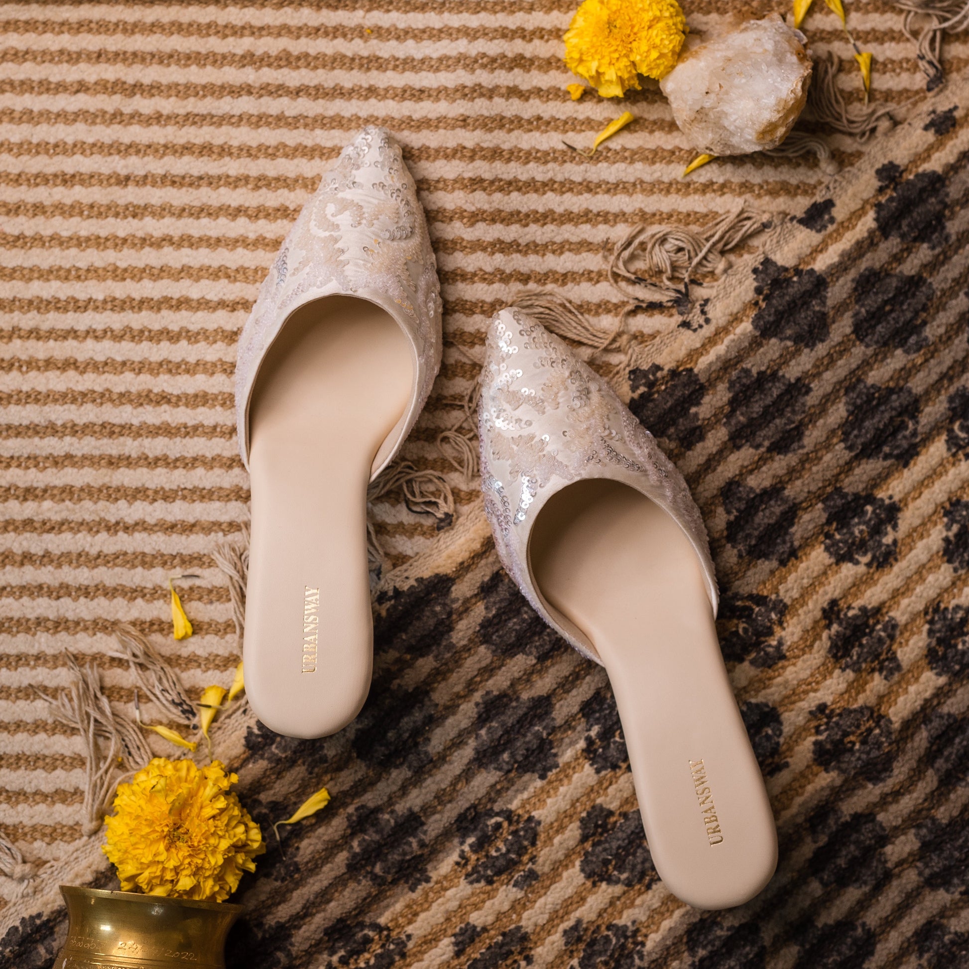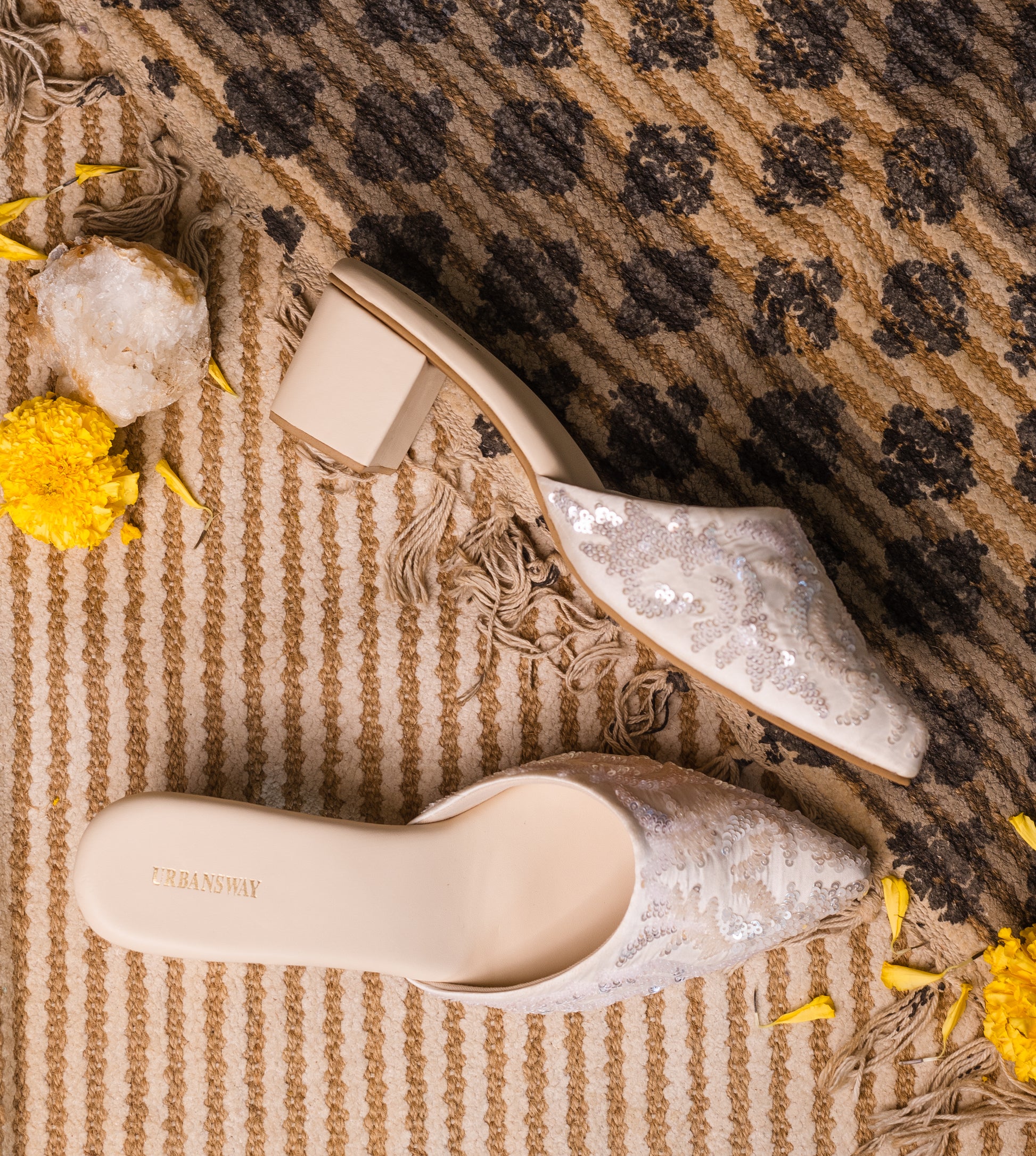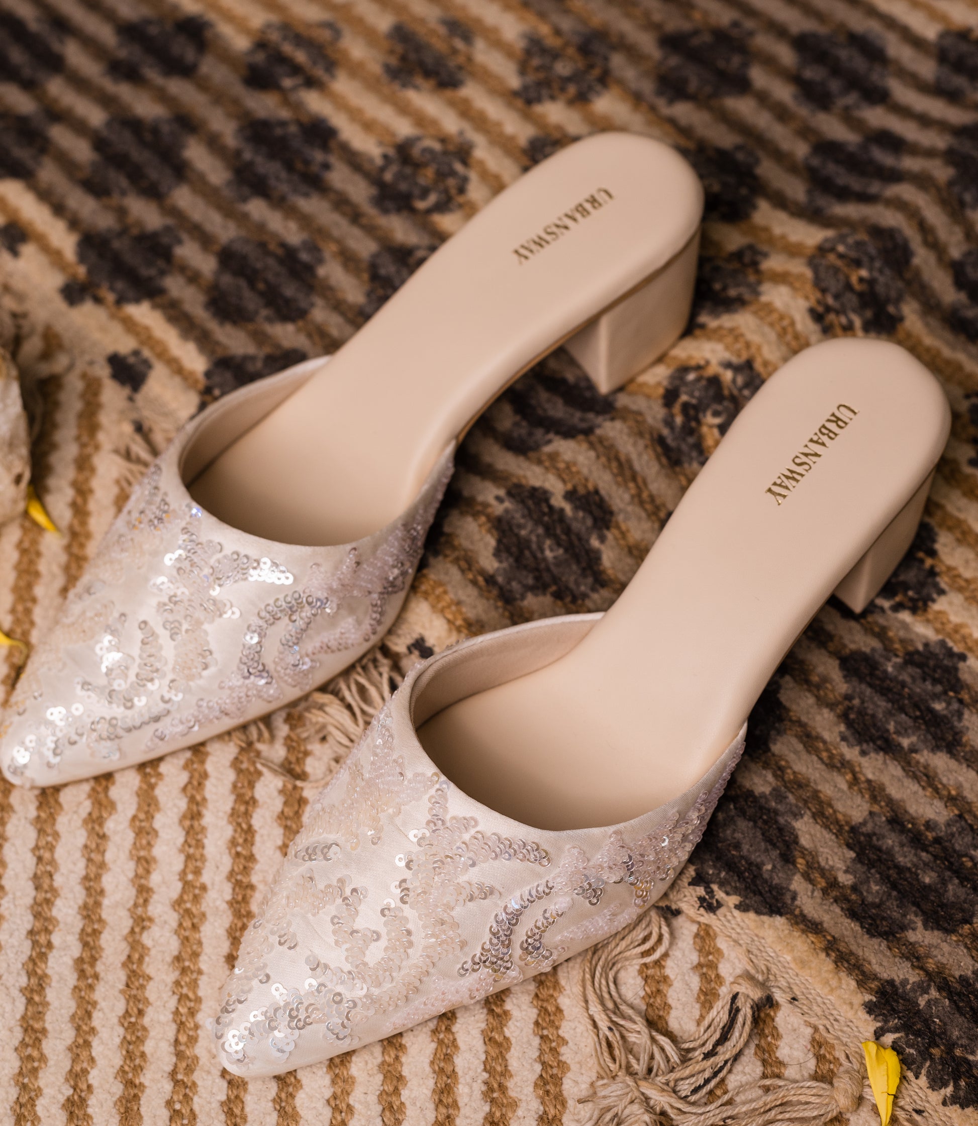 If you're someone who likes to keep it simple yet make a statement, our ivy embroidered mules are perfect for you! The handcrafted, two-inch white silk base block heels feature exquisite silver sequin embroidery all around. The luxury of comfort and style brought at your footsteps.