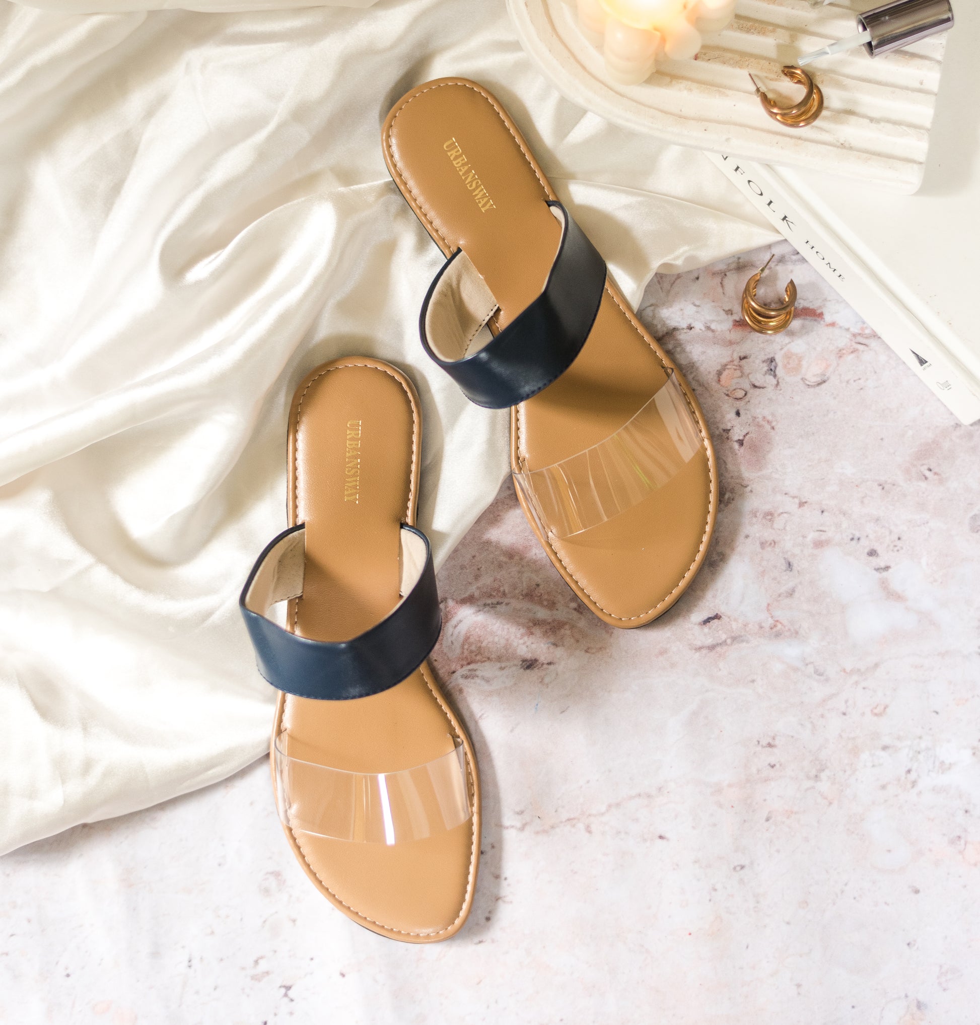Featuring a pair navy slip-in flats in vegan faux leather base with straps and double padded underlining.