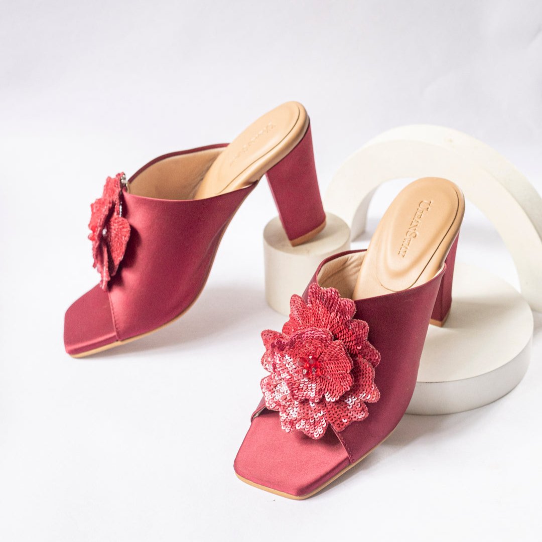 Stunning maroon open-toe heels with a detachable red rose clip adorned with sequin embroidery. This clip can be used to glam up or down your outfit in an instant. With versatile 3.5-inch heels, they add a pop of romance to any outfit.