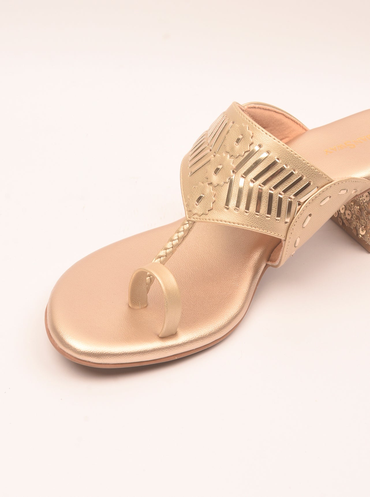 Add a hint of royal glow to your steps with our Sonaa Kolhapuri’s. These 2.5-inch block heels in gold embody craftsmanship at its finest. The magic lies in the heel, adorned with intricate embroidery of beads and sequins that catch the light with every move. Glamorous yet grounded in tradition, they are the golden touch every festive wardrobe needs.